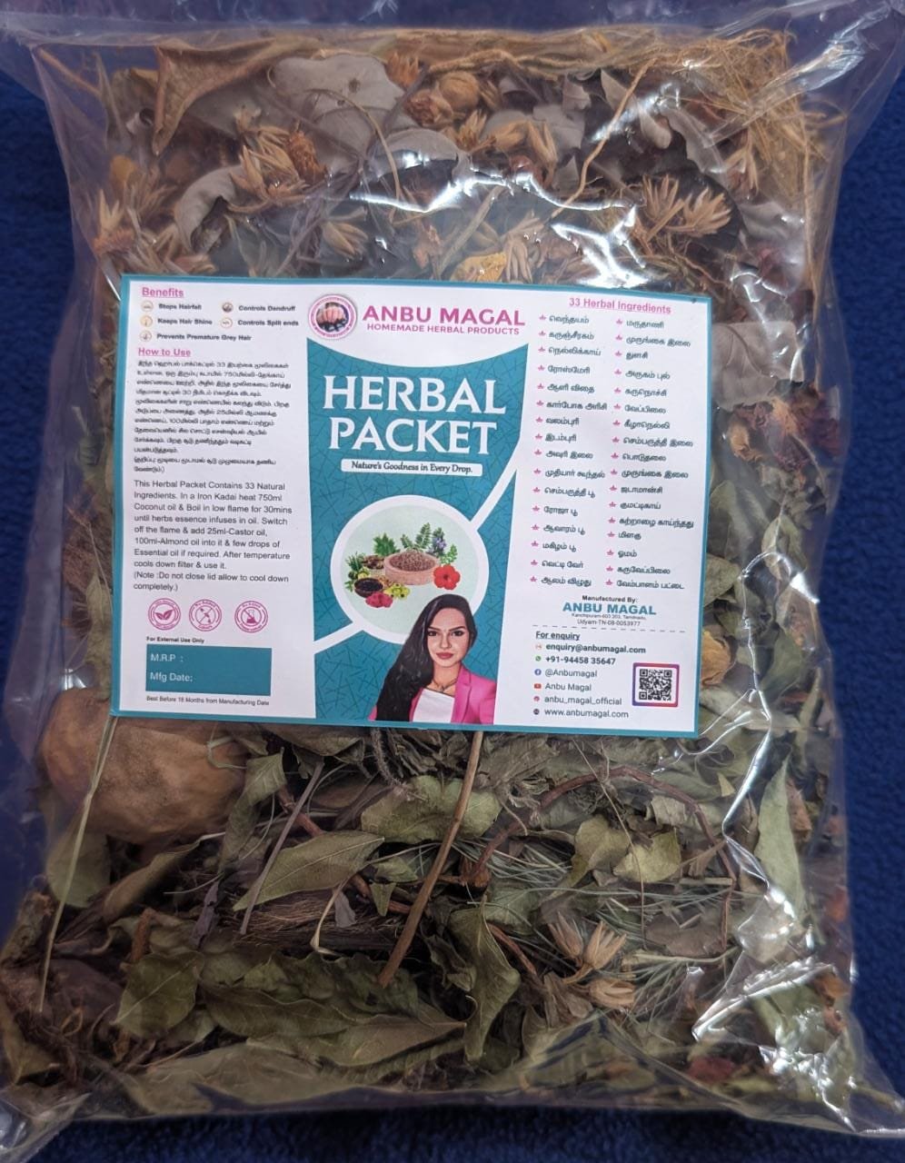 This Herbal Packet Contains 33 Natural Ingredients-வெந்தயம், மருதாணி, கருஞ்சீரகம், கரிசலாங்கண்ணி, நெல்லிக்காய், துளசி, ரோஸ்மேரி, அருகம் புல், ஆளி விதை, கருநொச்சி, கார்போக அரிசி, வேப்பிலை, வலம்புரி, கீழாநெல்லி, இடம்புரி, செம்பருத்தி இலை, அவுரி இலை, பொடுதலை, முதியார் கூந்தல், முருங்கை இலை, செம்பருத்தி பூ, ஜடாமான்சி, ரோஜா பூ, குமட்டிகாய், ஆவாரம் பூ, மிளகு, மகிழம் பூ, ஓமம், வெட்டி வேர், ஆலம் விழுது, கருவேப்பிலை, கரும்பூலா, கற்றாழை காய்ந்தது, வேம்பாளம் பட்டை.