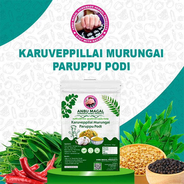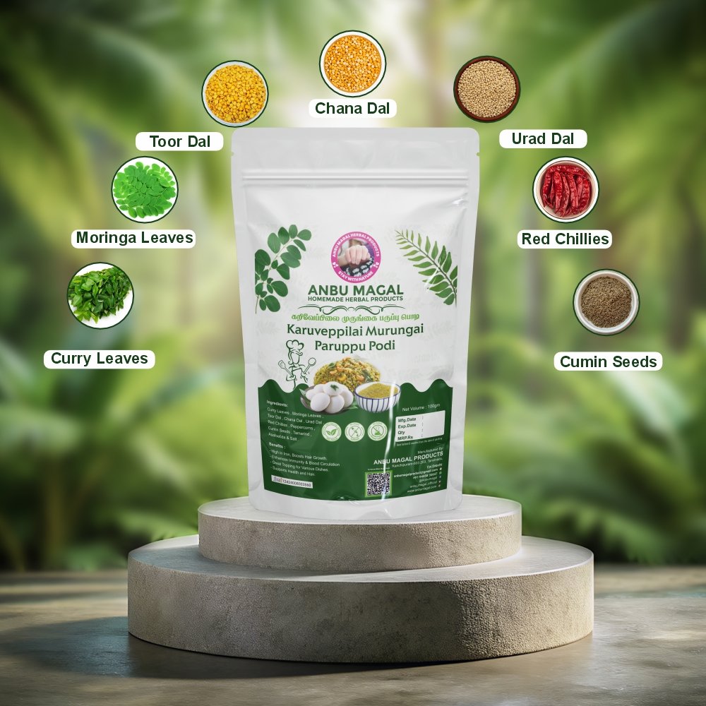 Karuveppilai Murungakeerai Paruppu Podi is a flavorful and nutritious South Indian spice powder made from curry leaves (karuveppilai), moringa leaves (murungakeerai), and lentils (paruppu). This aromatic podi is rich in essential nutrients, making it a healthy addition to your meals, especially for those looking for a wholesome, plant-based protein source.